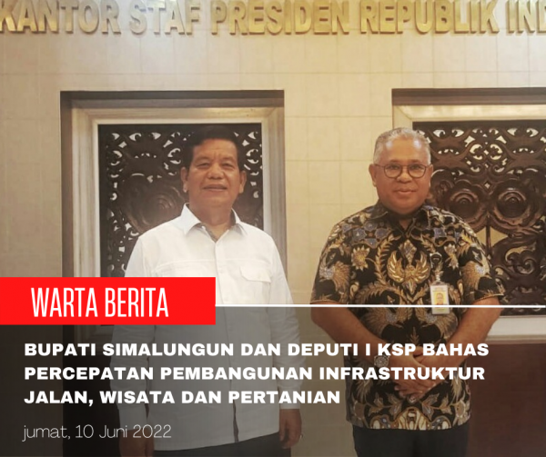 wartaberita.co.id – Simalungun | Bupati Simalungun Radiapoh Hasiholan Sinaga, bertemu dan berdiskusi soal percepatan pembangunan infrastruktur jalan, wisata dan pertanian bersama Deputi I Kantor Staf Presiden (KSP) Bidang Infrastruktur, Energi dan Investasi, Febry Calvin Tetelepta, Jum’at (10/6/2022)
