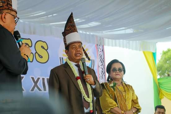Usai penyampaian kata sambutan, Bupati Radiapoh bersama Ny Ratnawati diberikan Hiou Pamonting oleh Ephorus GKPS sebagai tanda ucapan syukur.