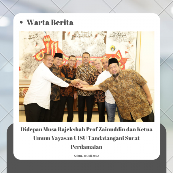 Mediasi ini pun difasilitasi oleh Wakil Gubernur (Wagub) Sumatera Utara (Sumut) Musa Rajekshah yang juga Ketua DPP Ikatan Keluraga Alumni UISU di Rumah Dinas Jabatan Wagub Sumut, Jalan Teuku Daud, Medan, Jumat (29/7). Penandatanganan surat perdamaian ini diharap dapat menjaga stabilitas kondusif di lingkungan UISU.