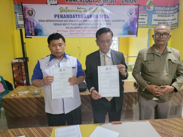 Hadir dalam penandatanganan, Kadis Dukcapil Jara Trisepto Lumbantoruan, S.Pd dengan Ketua CU Bahen Ma Nadenggan Junior Julius Lumbantoruan, SH.