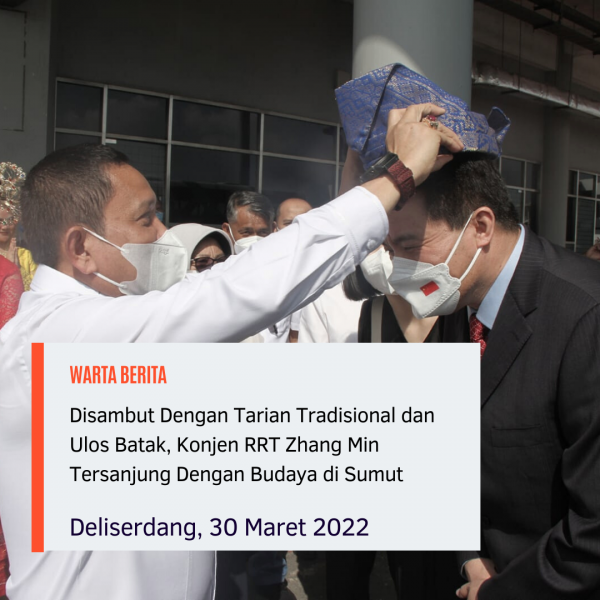 Zhang Min dan Liu Yuqing disambut dengan tarian tradisional asal Sumut dan disematkan Ulos dipintu masuk kedatangan VIP Bandara KNIA oleh Asisten Pemerintahan dan Kesejahteraan Rakyat Mhd Fitriyus yang mewakili Gubernur Sumut Edy Rahmayadi.