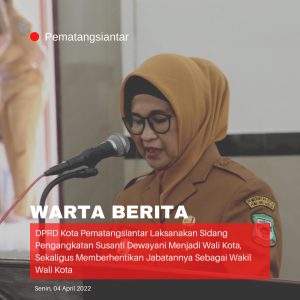 wartaberita.co.id – Pematangsiantar | Plt. Walikota Pematangsiantar dr Hj Susanti Dewayani,Sp.A menghadiri Rapat Paripurna ke IV tentang Pengusulan Pengangkatan dan Pengesahan Wakil Walikota Menjadi Walikota Pematangsiantar dan Sekaligus Pengusulan Pemberhentian Wakil Walikota Pematangsiantar, di Ruang Sidang DPRD Kota Pematangsiantar, Sinin (04 April 2022).