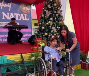 Febelia merupakan penyandang disabilitas yang mengharuskannya duduk di kursi roda dan binaan Pantai Asuhan Yayasan Pelita Pancasila Asa Nduka Karina di Kabupaten Pakpak Bharat.