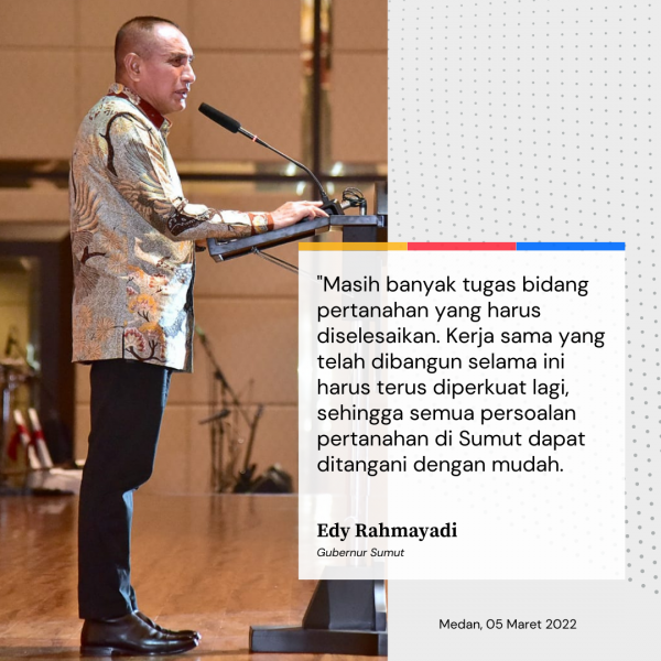 Edy mengatakan, kerja sama antarinstansi sangat dibutuhkan, sebab masih banyak tugas bidang pertanahan yang harus diselesaikan. Kerja sama yang telah dibangun selama ini harus terus diperkuat lagi, sehingga semua persoalan pertanahan di Sumut dapat ditangani dengan mudah.