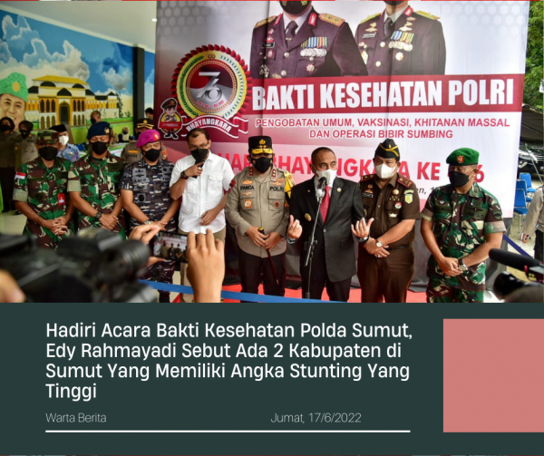 “Khususnya soal kesehatan masyarakat, ada dua kabupaten (di Sumut) yang masih tinggi sekali angka stuntingnya. Untuk ini kami sudah koordinasi, bersama Bhayangkari nantinya, dan tokoh pemuda untuk sama-sama mengatasi hal ini. Semoga bertambahnya usia (Bhayangkara), Polri akan semakin bermanfaat bagi masyarakat,” ujar Gubernur.