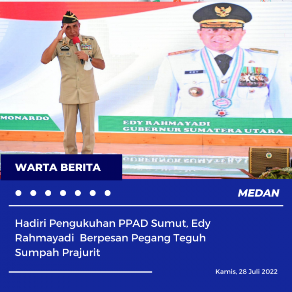 wartaberita.co.id – MEDAN | Gubernur Sumatera Utara (Sumut) Edy Rahmayadi berpesan kepada pengurus Persatuan Purnawirawan Angkatan Darat (PPAD) Provinsi Sumut untuk tetap memegang teguh sumpah prajurit TNI dalam menjalankan organisasi. Salah satunya untuk setia kepada Negara Kesatuan Republik Indonesia (NKRI) yang berdasarkan Undang-Undang Dasar 1945.
