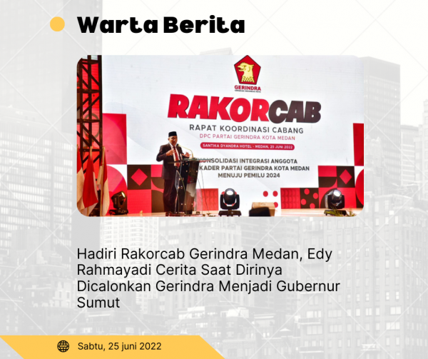 “Gerindra adalah partai pertama yang memberi perahu pada saya untuk saya naiki,” kata Edy Rahmayadi saat pembukaan Rakorcab DPC Partai Gerindra Medan di Hotel Santika Dyandra, Jalan Kapten Maulana Lubis, Medan, Sabtu (25/6).