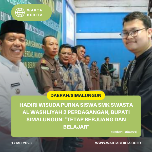 wartaberita.co.id – Simalungun | Bupati Simalungun Radiapoh Hasiholan Sinaga menghadiri wisuda purna siswa SMK Swasta Al-Washliyah 2 Perdagangan Tahun Pelajaran (TP) 2022/2023 di Green Starpark Kota Perdagangan, Kecamatan Bandar, Simalungun, Sumut, Rabu (17/5/2023).