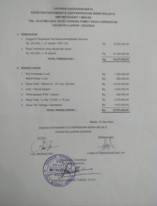 Dikutip dari laporan anggaran biaya kegiatan tersebut diantaranya anggaran perpisahan dari biaya perlengkapan tahunan sebesar Rp 250.000 persiswa sebanyak 57 siswa dan biaya tambahan yang dikutip dari siswa sebesar Rp 450.000 persiswa dari 50 siswa sehingga total pemasukan Rp.34.075.000.(Red)