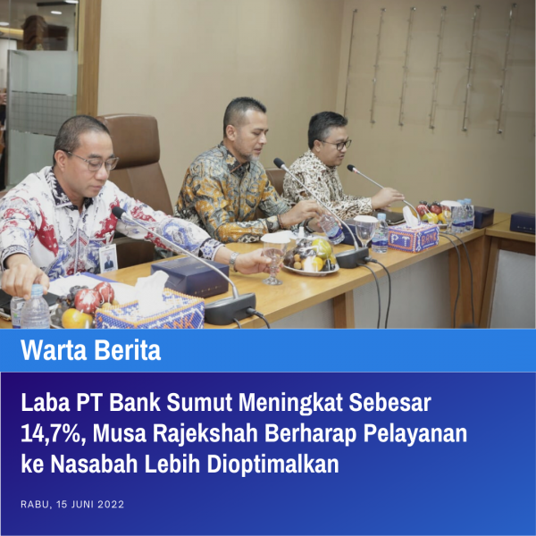 Hal ini disampaikan oleh Direktur Utama Bank Sumut, Rahmat Fadilah Pohan saat menyampaikan kinerja Bank Sumut ke Wakil Gubernur (Wagub) Sumatera Utara (Sumut) Musa Rajekshah di Kantor Bank Sumut, Jalan Imam Bonjol, Rabu (15/6). Ia juga menjelaskan Laba PT Bank Sumut meningkat Rp38 miliar atau 14,7% di Mei 2022 dibandingkan tahun lalu atau secara YoY, dari Rp259 miliar menjadi Rp296 miliar.