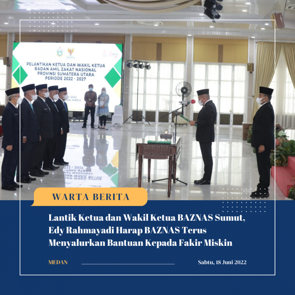 wartaberita.co.id – MEDAN | Gubernur Sumateta Utara (Sumut) Edy Rahmayadi melantik Ketua dan Wakil Ketua Badan Amil Zakat Nasional (BAZNAS) Sumut priode 2022-2027 di Aula Tengku Rizal Nurdin, Rumah Dinas Gubernur, Jalan Jenderal Sudirman Nomor 41 Medan, Jumat (17/6). Diharapkan potensi zakat Sumut yang mencapai Rp8 Trilun dapat dikelola secara maksimal.