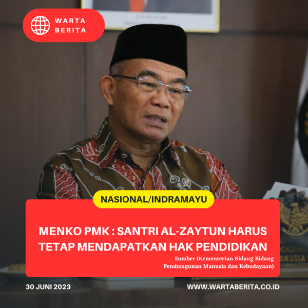 wartaberita.co.id – Indramayu | Menteri Koordinator Bidang Pembangunan Manusia dan Kebudayaan (Menko PMK) Muhadjir Effendy secara tegas menjelaskan bahwa nasib santri yang menempuh pendidikan di Pondok Pesantren Al-Zaytun harus tetap mendapatkan haknya. Hal itu disampaikan setelah mendengar paparan dan penjelasan mengenai temuan dari kementerian/lembaga serta Pemerintah Provinsi Jawa Barat setelah melakukan investigasi dalam Rapat Koordinasi Tindaklanjut Penanganan Pondok Pesantren Al-Zaytun secara daring, pada Jum’at (30/6/2023).