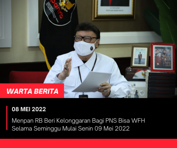 wartaberita.co.id – JAKARTA | Menteri Pendayagunaan Aparatur Negara dan Birokrasi (PANRB) Thahjo Kumolo, beri kelonggaran untuk PNS bisa kerja dari rumah atau work from home (WFH) selama seminggu, yang dimulai pada Senin, 09 Mei 2022.