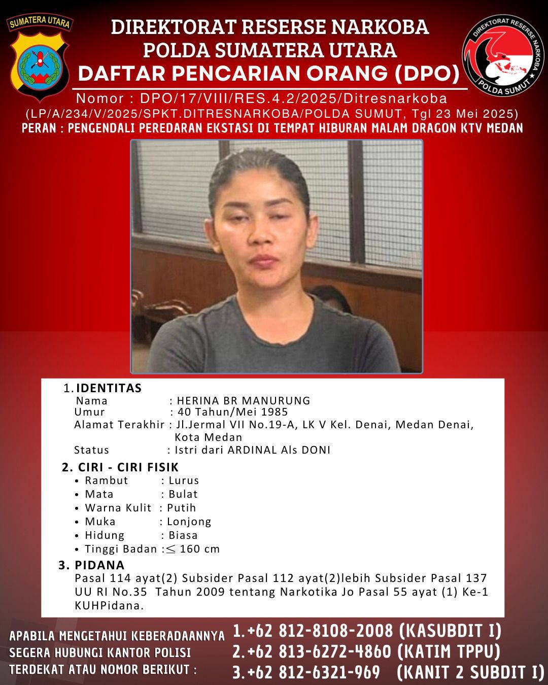 “Dari hasil penyelidikan dan keterangan para tersangka, kami menetapkan Ardinal alias Doni dan Herina br Manurung sebagai DPO. Mereka berperan sebagai pengendali peredaran narkotika di Dragon KTV,” tegas Dirresnarkoba Polda Sumut, Kombes Pol Jean Calvijn Simanjuntak, Selasa (2/9/2025).