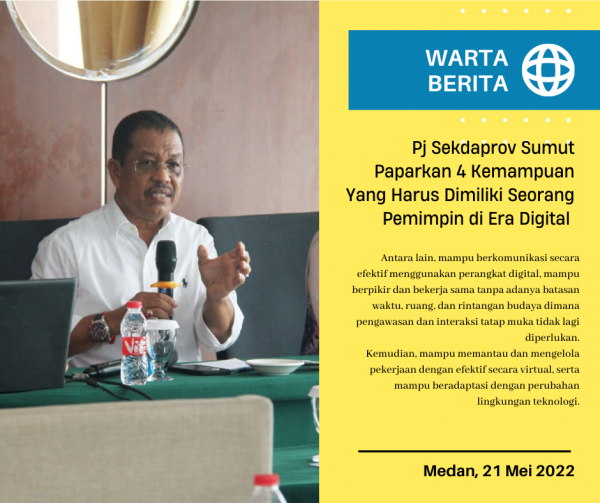 Hal itu disampaikan Penjabat (Pj) Sekretaris Daerah Provinsi (Sekdaprov) Sumatera Utara (Sumut) Afifi Lubis diwakili Plt Kepala Dinas Komunikasi dan Informatika (Diskominfo) Provinsi Sumut Kaiman Turnip, pada acara sosialisasi program Digital Leadership Academy (DLA) di Hotel Emerald Garden Medan Jalan Kol. Yos Sudarso Nomor 1 Medan, Jumat (20/5).