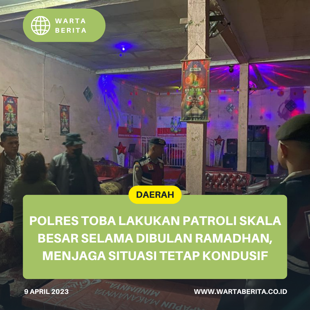 www.wartaberita.co.id – Medan | Kapolres Toba AKBP Taufiq Hidayat Thayeb, S.H., S.I.K, melalui Kasi Humas Polres Toba AKP Bungaran Samosir saat di konfirmasi menyebut pihaknya akan menggelar patroli skala besar secara rutin sepanjang bulan puasa demi menjaga suasana Ramadan tetap kondusif, Sabtu (08/04/2023).