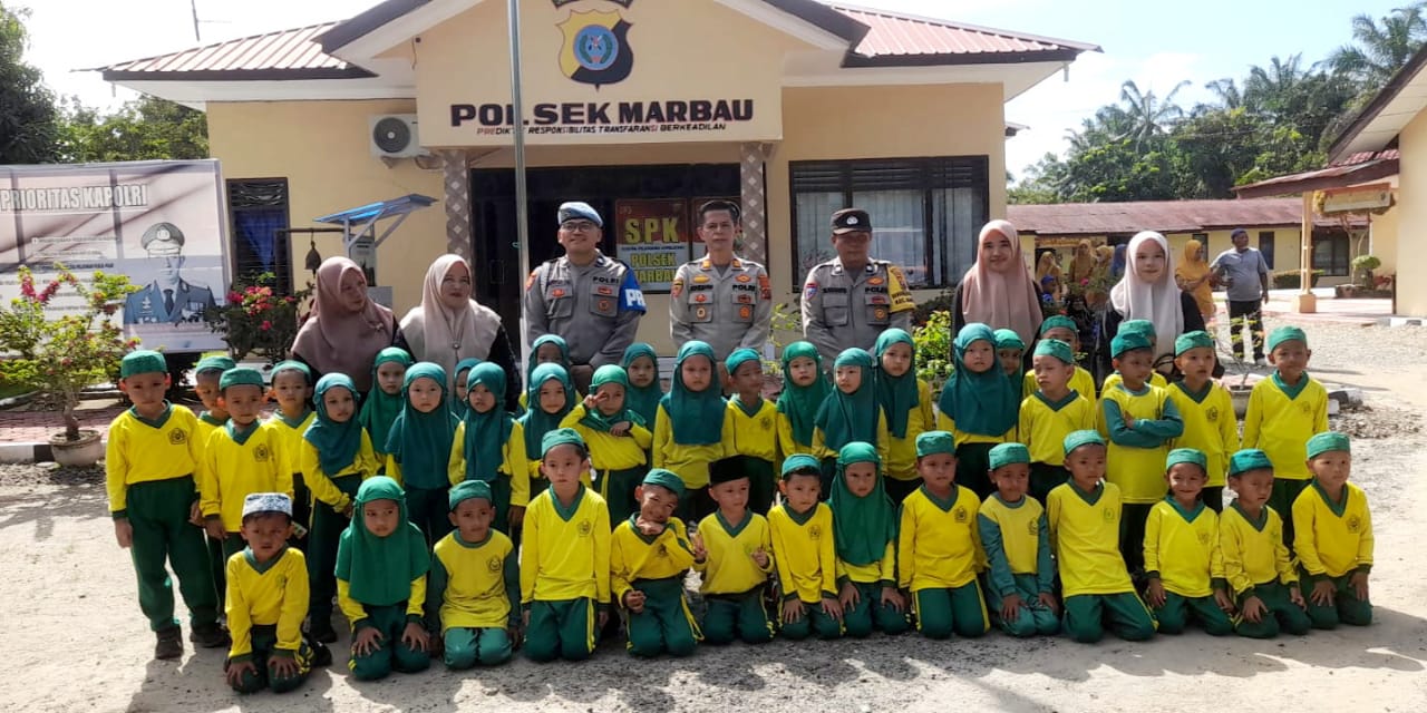 Kunjungan edukatif yang diikuti sekitar 100 anak TK bersama belasan guru pendamping ini disambut hangat oleh Kapolsek Marbau AKP Jhonly HW Purba, SH, beserta jajaran kepolisian setempat.