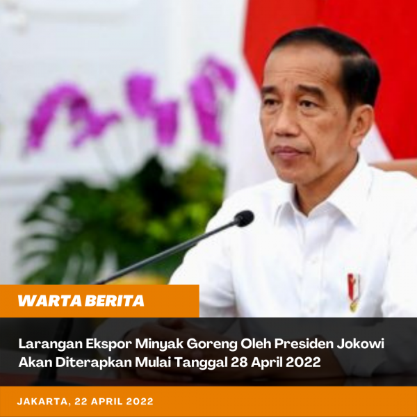 “Saya putuskan Pemerintah melarang ekspor bahan baku minyak goreng dan minyak goreng mulai Kamis, 28 April 2022 sampai batas waktu yang akan ditentukan kemudian,” ujar Presiden saat memimpin rapat tentang pemenuhan kebutuhan pokok rakyat, di Istana Merdeka, Jakarta, pada Jumat, (22 April 2022).