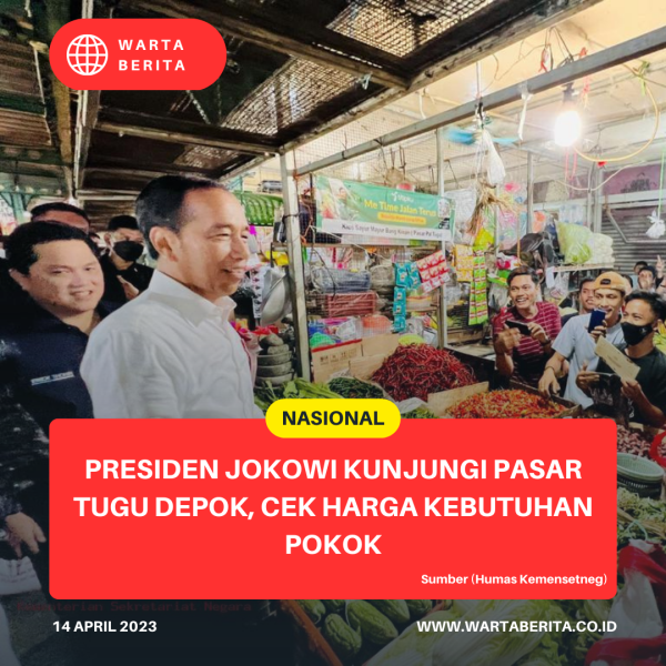 www.wartaberita.co.id – Jakarta | Presiden Joko Widodo mengunjungi Pasar Tugu Palsigunung, Kecamatan Cimanggis, Kota Depok, Provinsi Jawa Barat, pada Kamis (13/4/2023). Dalam kunjungan tersebut, Kepala Negara mengecek harga sejumlah kebutuhan pokok yang ada di pasar tersebut sepekan menjelang Hari Raya Idulfitri 1444 Hijriah.