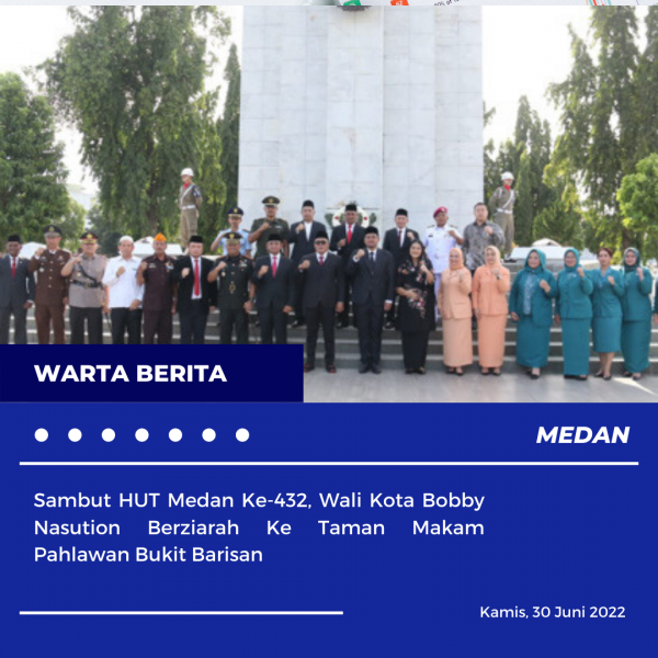 wartaberita.co.id – MEDAN | Menjelang HUT Kota Medan Ke-432 Tahun yang jatuh pada 1 Juli 2022, Wali Kota Medan Bobby Nasution bersama Ketua TP PKK Kota Medan Ny. Kahiyang Ayu M. Bobby Afif Nasution berziarah ke Taman Makam Pahlawan Bukit Barisan di jalan SM. Raja, Kamis (30/6).