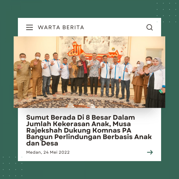 wartaberita.co.id – MEDAN | Pemerintah Provinsi Sumatera Utara (Pemprov Sumut) tetap komitmen dalam mengurangi angka kasus kekerasan pada anak. Karena itu, Wakil Gubernur (Wagub) Sumut Musa Rajekshah sepakat dengan Komisi Nasional Perlindungan Anak (Komnas PA) untuk membangun perlindungan berbasis anak dan desa.