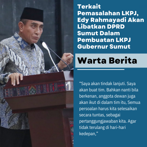 wartaberita.co.id – MEDAN | Gubernur Sumatera Utara (Sumut) Edy Rahmayadi akan menindaklanjuti rekomendasi hasil pembahasan Dewan Perwakilan Rakyat Daerah (DPRD) Provinsi Sumut, terhadap Laporan Keterangan Pertanggungjawaban (LKPJ) Gubernur Sumut akhir tahun 2021. Untuk itu, Gubernur akan membentuk tim yang melibatkan berbagai pihak, termasuk anggota DPRD Sumut.