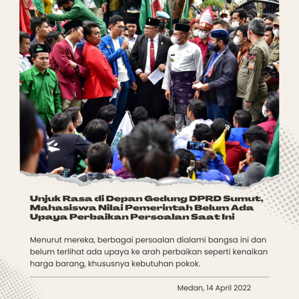 Dalam orasinya, para mahasiswa menyuarakan aspirasi terkait masalah yang belakangan mencuat di masyarakat se-Indonesia. “Jelaskan kepada kami, terkait isu kenaikan BBM, kenaikan PPN, kenaikan harga minyak goreng dan kami juga meminta agar aparat mengusut tuntas mafia minyak goreng, khususnya di Provinsi Sumatera Utara,” ujar Ketua PKC PMII Sumut Muhammad Tarmizi bersama pimpinan HIMMAH, GMNI, IMM dan KAMMI.