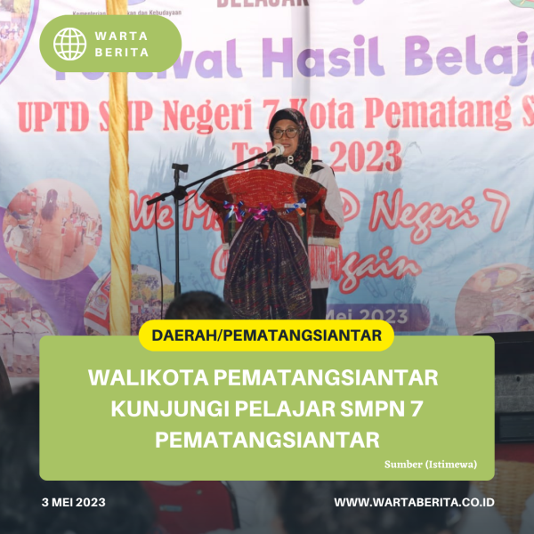 wartaberita.co.id – Pematangsiantar | Walikota Pematangsiantar dr Susanti Dewayani SpA mengapresiasi ajang Festival Hasil Pelajar SMP Negeri 7 Kota Pematangsiantar Tahun 2023. Kegiatan yang dihadiri langsung dr Susanti itu dilaksanakan di lapangan SMP Negeri 7, Jalan Sisingamangaraja, Kelurahan Sigulang-Gulang, Kecamatan Siantar Utara, Rabu (3/5/2023) pagi.